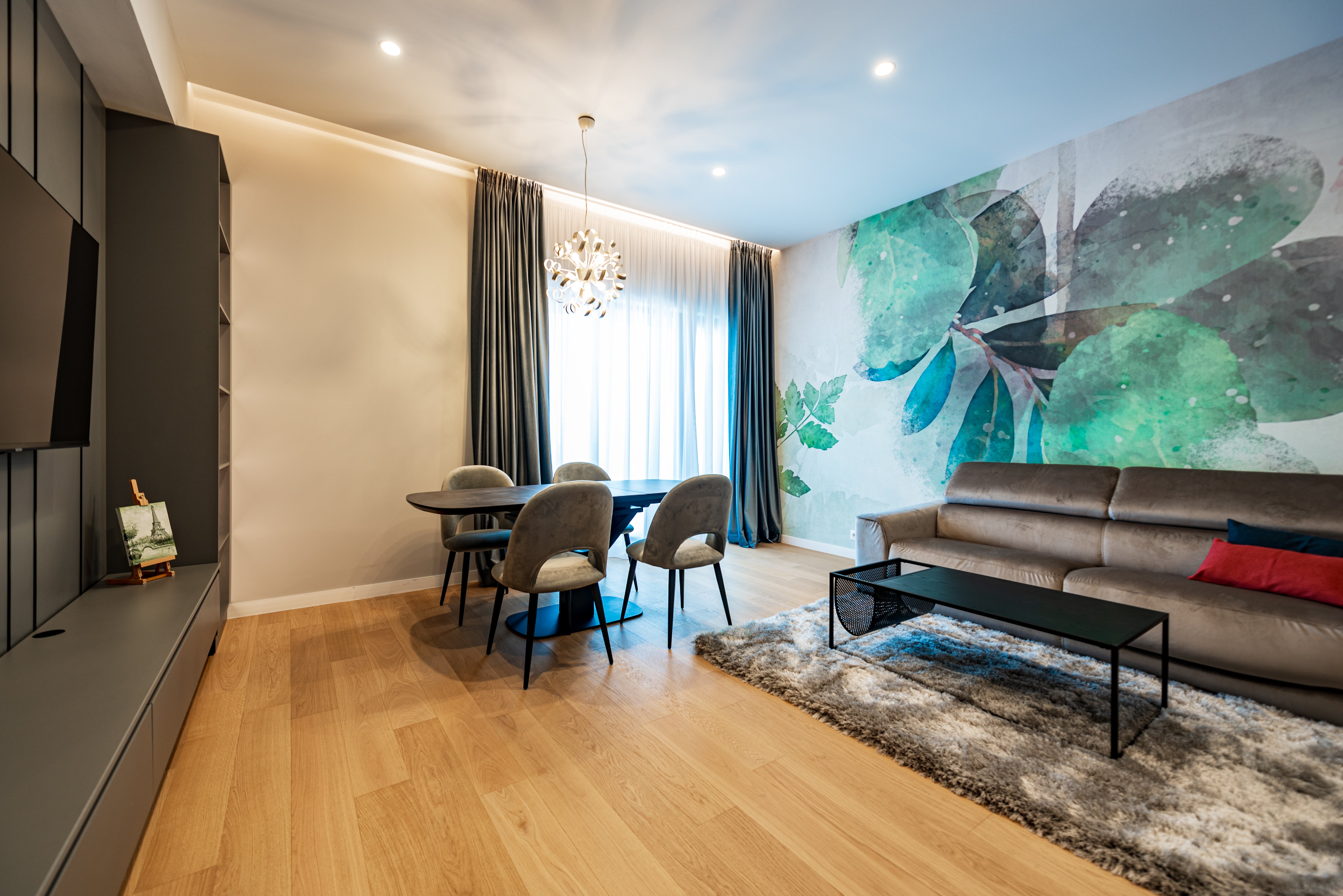 In living, accentul cade pe crearea unei atmosfere primitoare si flexibile. O lustra centrala asigura iluminatul general, completata de lampadare sau aplice de perete pentru lumina ambientala. Pentru un plus de eleganta, poti adauga spoturi directionale care evidentiaza tablouri sau decoratiuni.