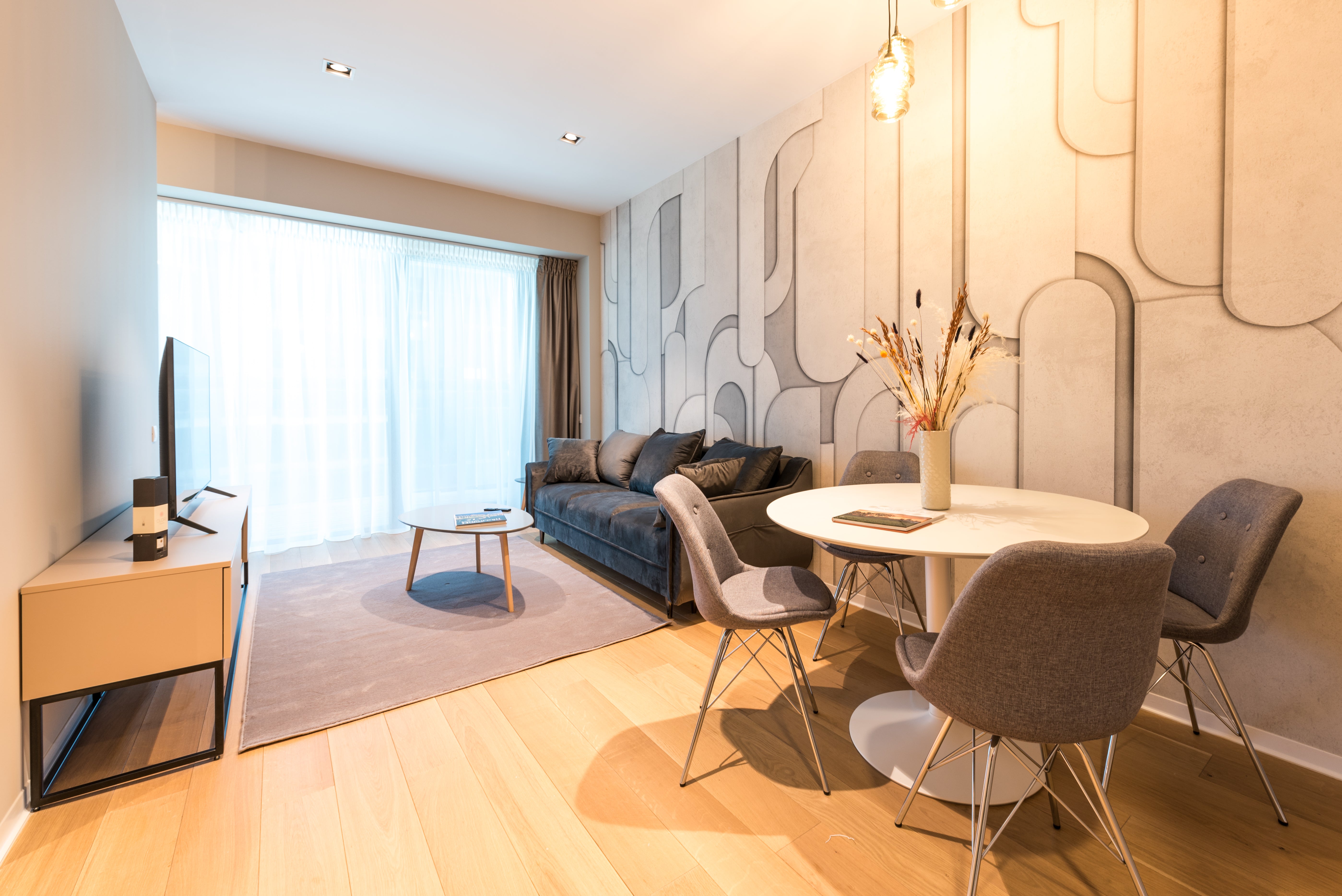 Pentru spatiile mici, o masa extensibila este ideala, iar scaunele pliante sau cele care se pot depozita usor sunt extrem de practice. Astfel, poti adapta zona de dining in functie de numarul de persoane fara a compromite confortul zilnic.